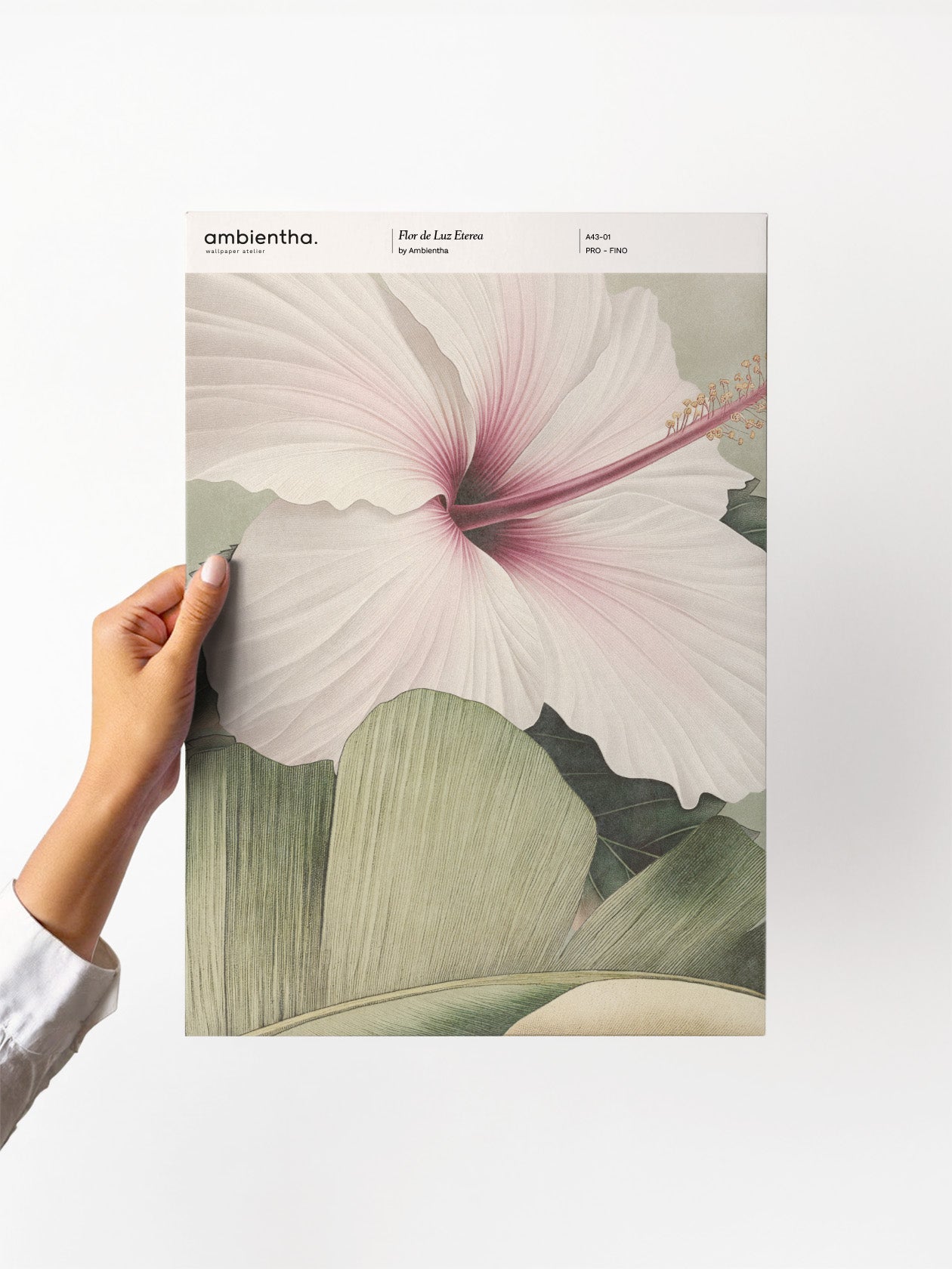 Discover the sample of the Flor de Luz Eterea wallpaper: where large flowers stand out among tropical leaves, almost iridescent shades and golden lights.