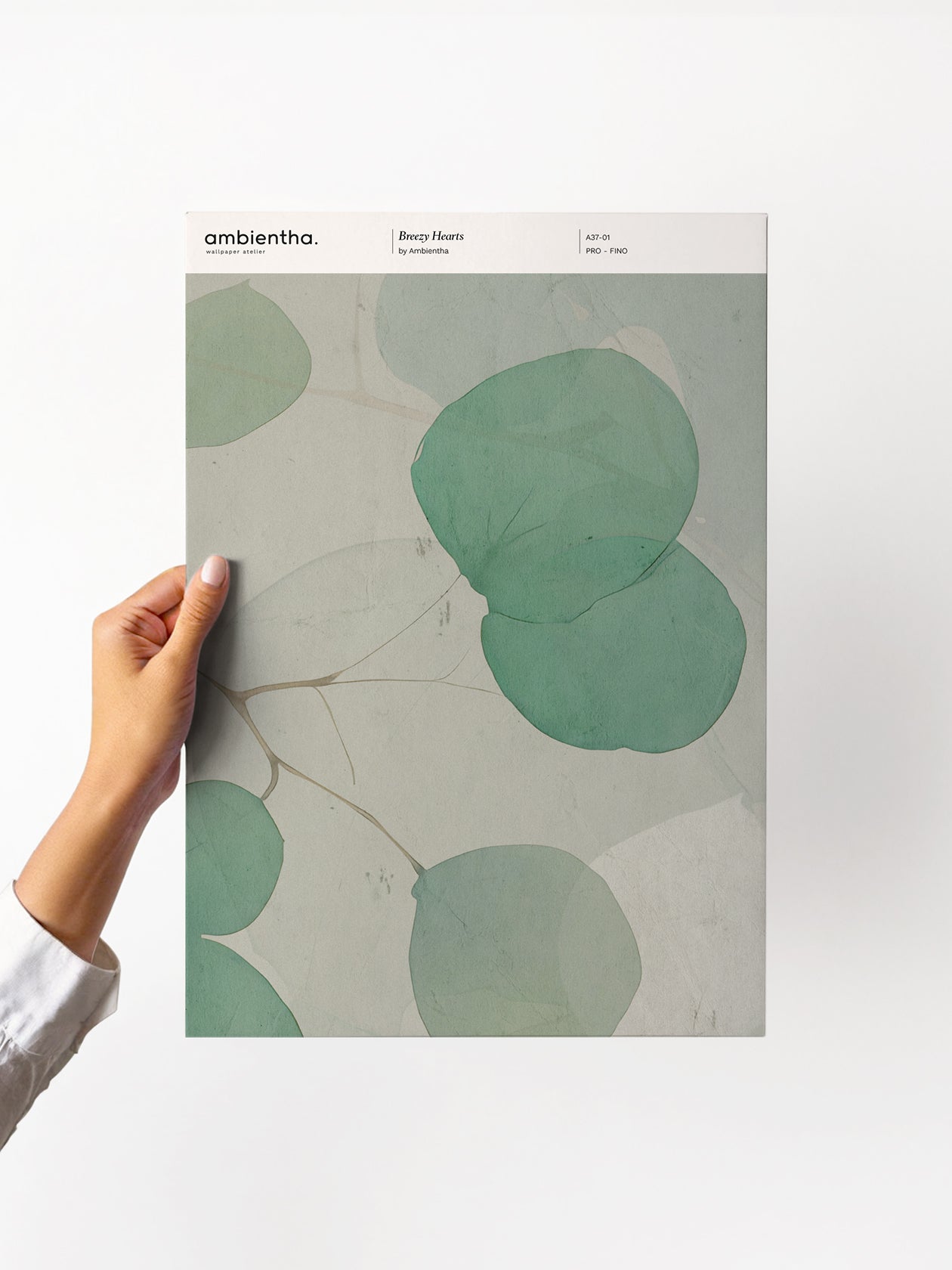 The watercolours of the Breezy Hearts wallpaper depict the meeting of two eucalyptus branches. The heart-shaped leaves fade on the wall to frame the sleeping area, or a Scandinavian living room, with natural and romantic lines.