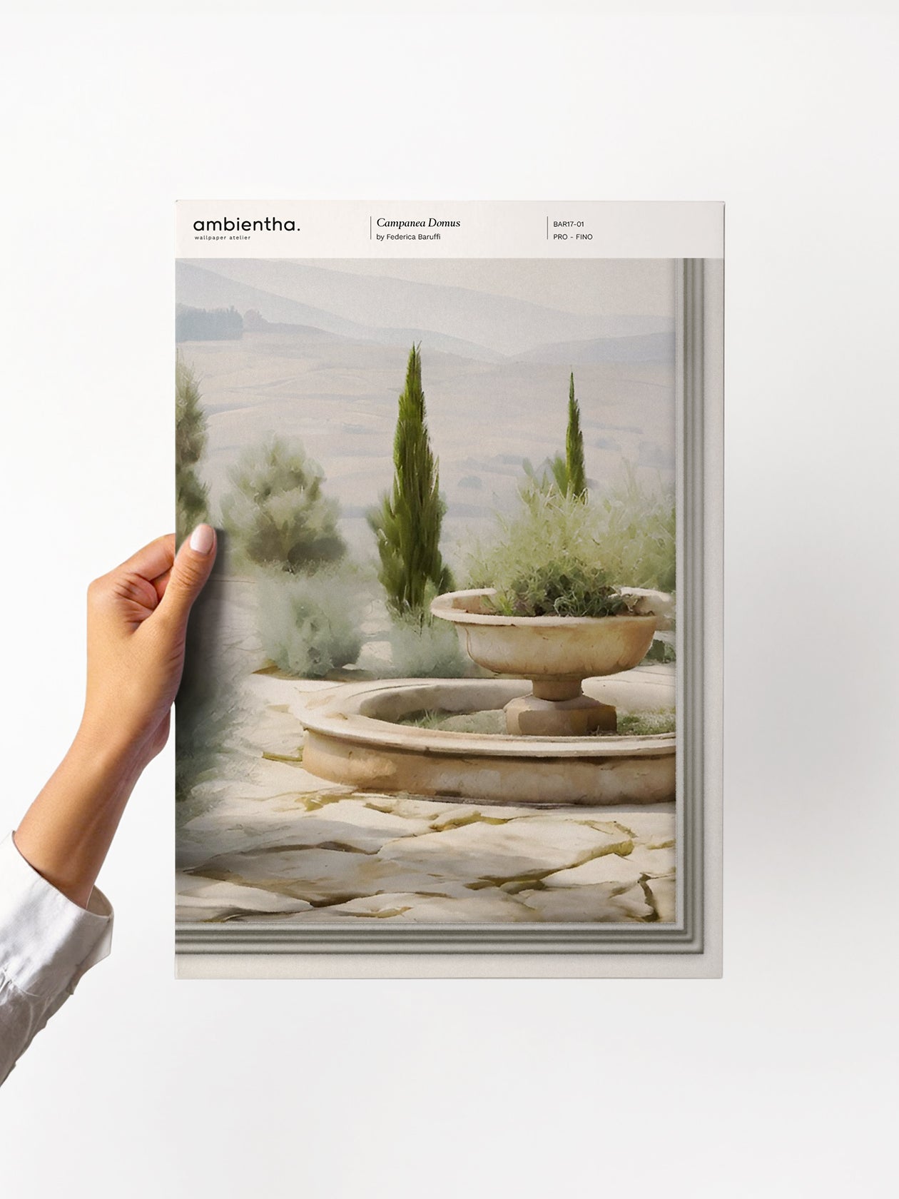 The gaze and memory are directed towards the garden: here are the romantic hilly landscapes of central Italy. The perspective paintings of Campanea wallpaper are the panoramic solution for projects with a rustic and classic style.