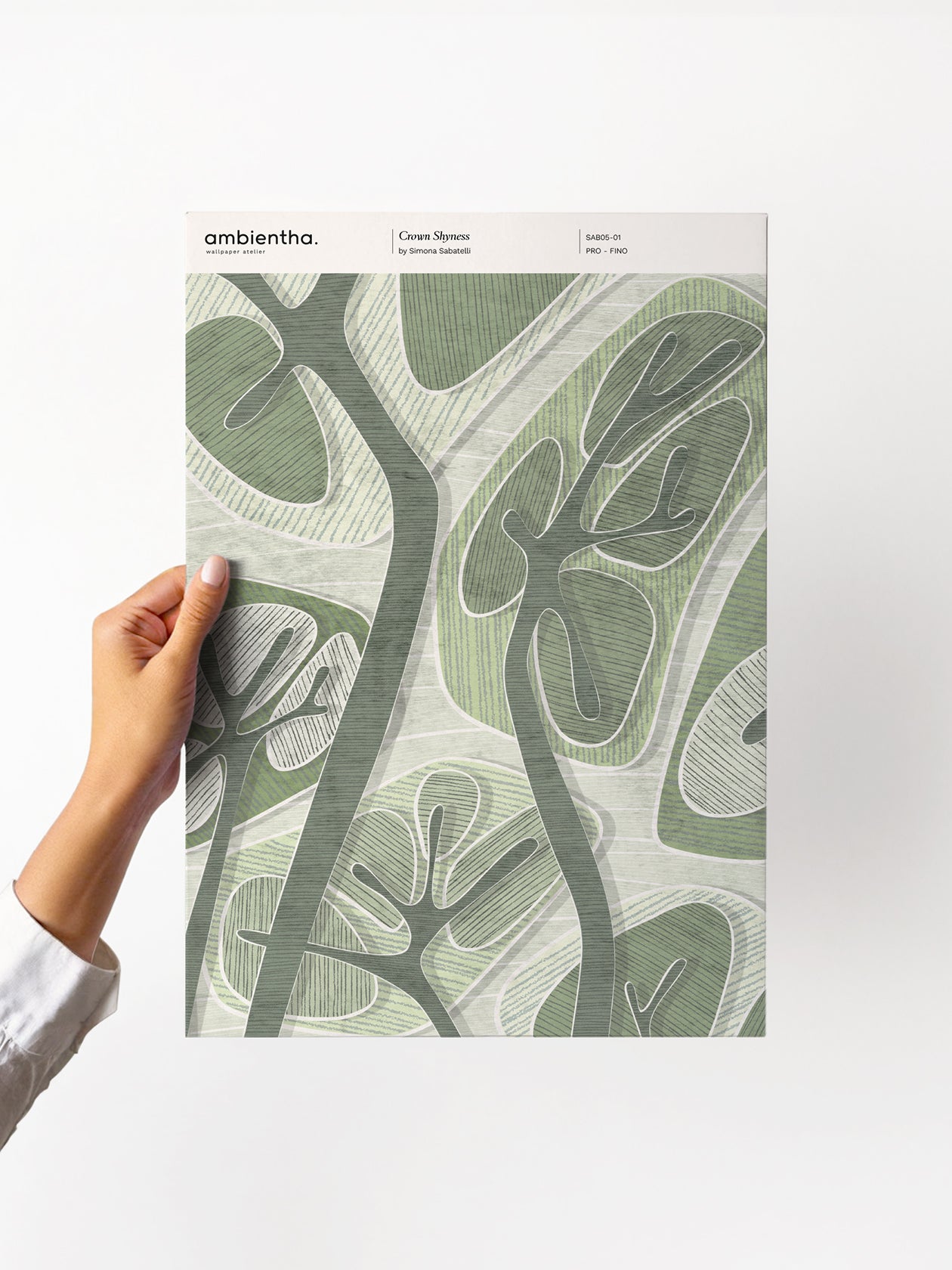 The wallpaper tells the story of the natural phenomenon of the crown shyness: the magical interlocking of trees that grow in space without touching each other. Crown is the green, playful and essential monochromatic design with a wooden texture.