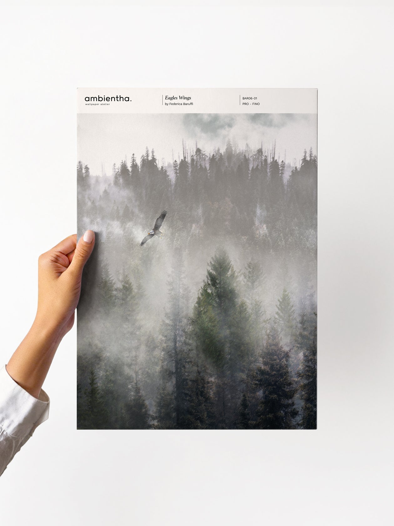 Calm and freedom in the design that smells of winter. Eagles Wings fills the atmosphere with the fresh breath of the mountains. An evanescent landscape, a watercolour photography for contemporary interiors: the magic of nature is reflected on the wallpaper.