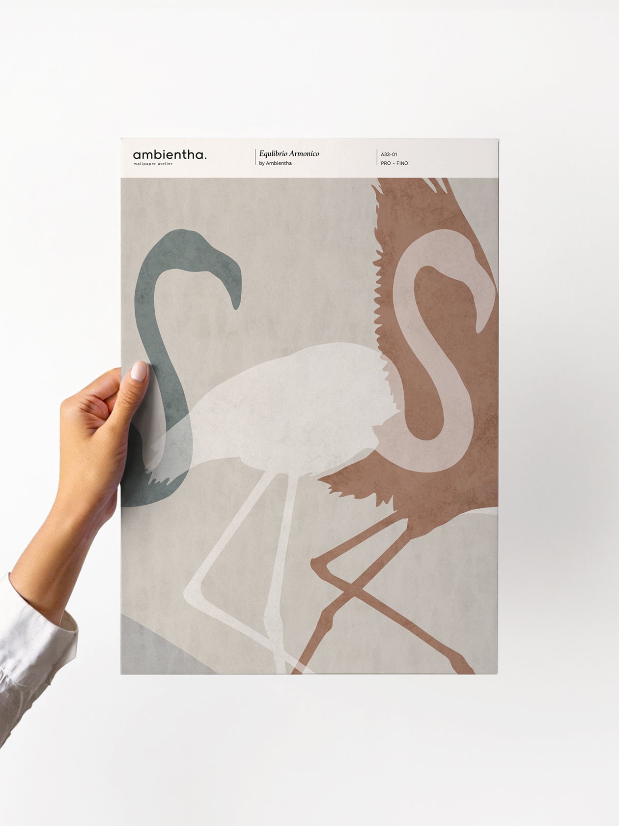 The wallpaper gives a graceful and contemporary vision of a now worn-out subject. The flamingo, an animal that bases its charm on Balance, leaves its stable position to take off. To create atmospheres with an ethnic appeal with design in natural tones and textures.