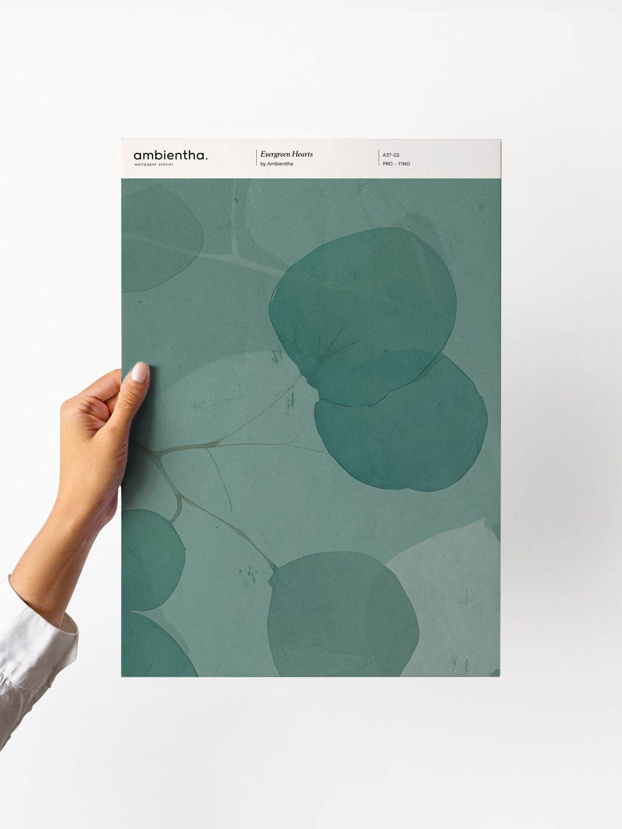 The watercolors of the Evergreen Hearts wallpaper depict the meeting of two eucalyptus branches. The heart-shaped leaves fade on the wall to frame the sleeping area, or a Scandinavian living room, with natural and romantic lines.