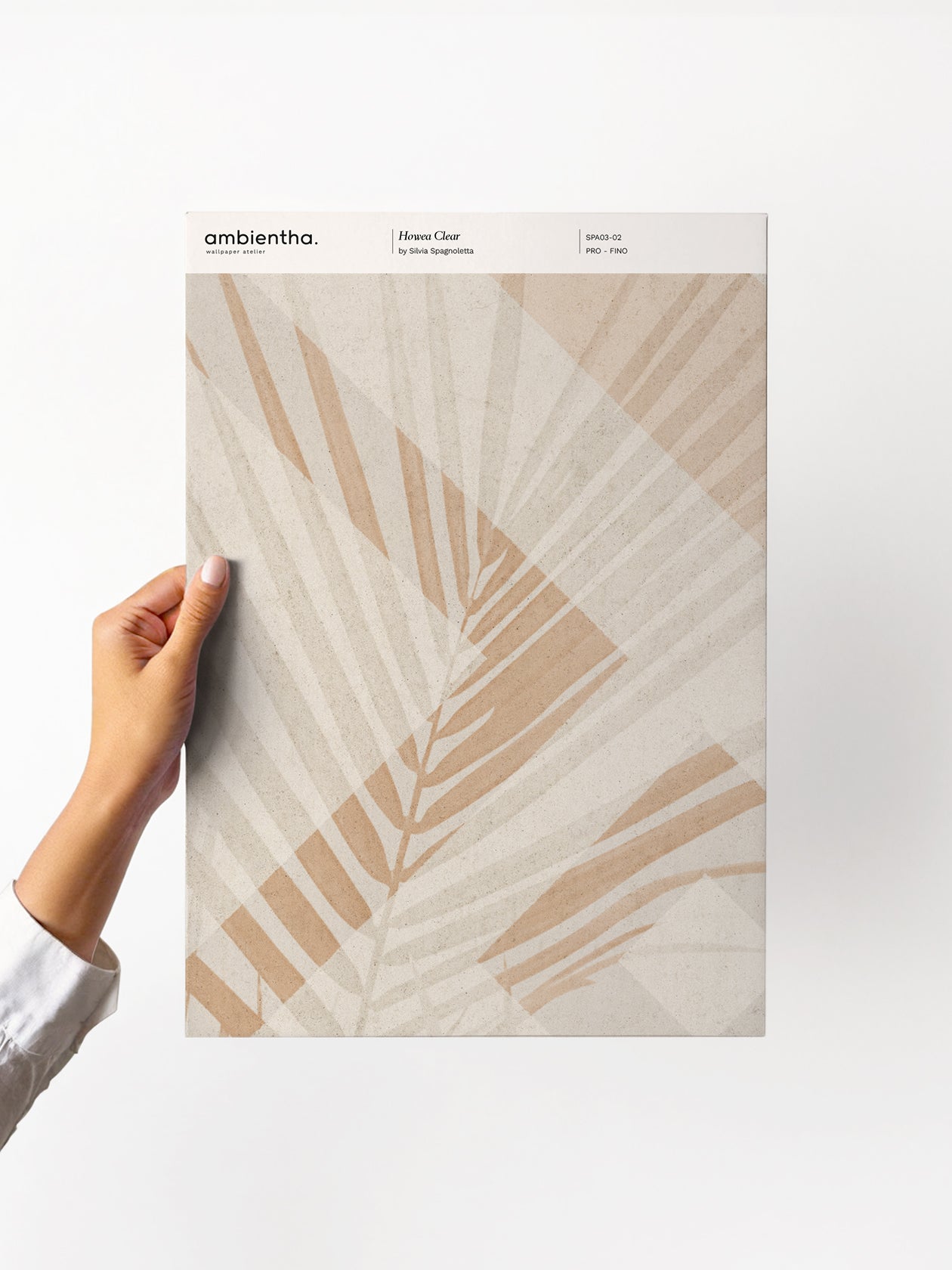 An exotic elegance. The light bounces off the walls and filters through the kenzia leaves, thus Howea Clear furnishes the rooms. Ethnic-inspired geometries and overlapping shades on the neutral background. Depth, intensity and refinement in the wallpaper.