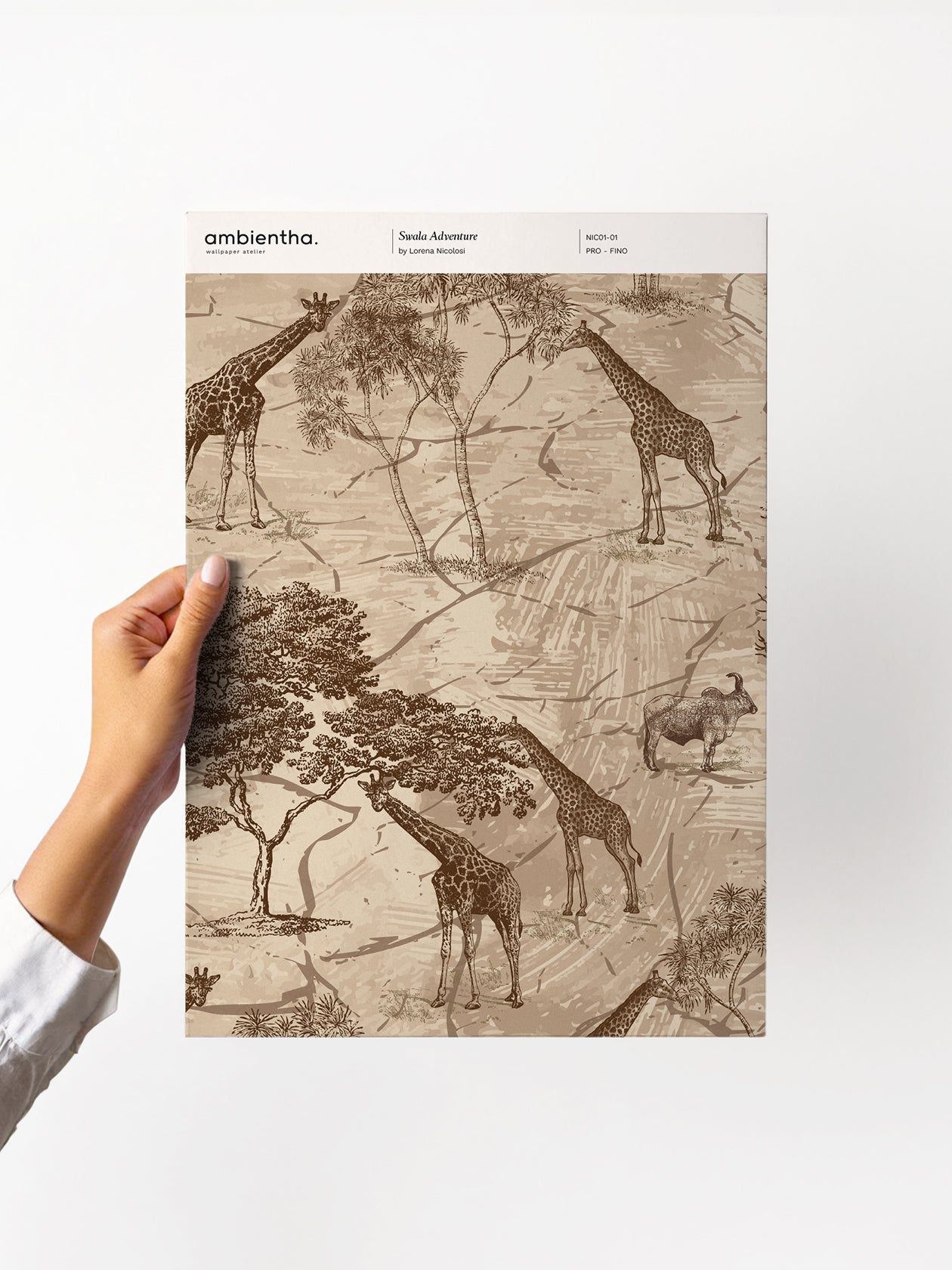 The pristine African land. Swala Adventure wallpaper dresses the walls in a contemporary ethnic style where the giraffe is the protagonist among the natural shades. A pressing rhythm characterizes the environment as if to remember tribal sounds.