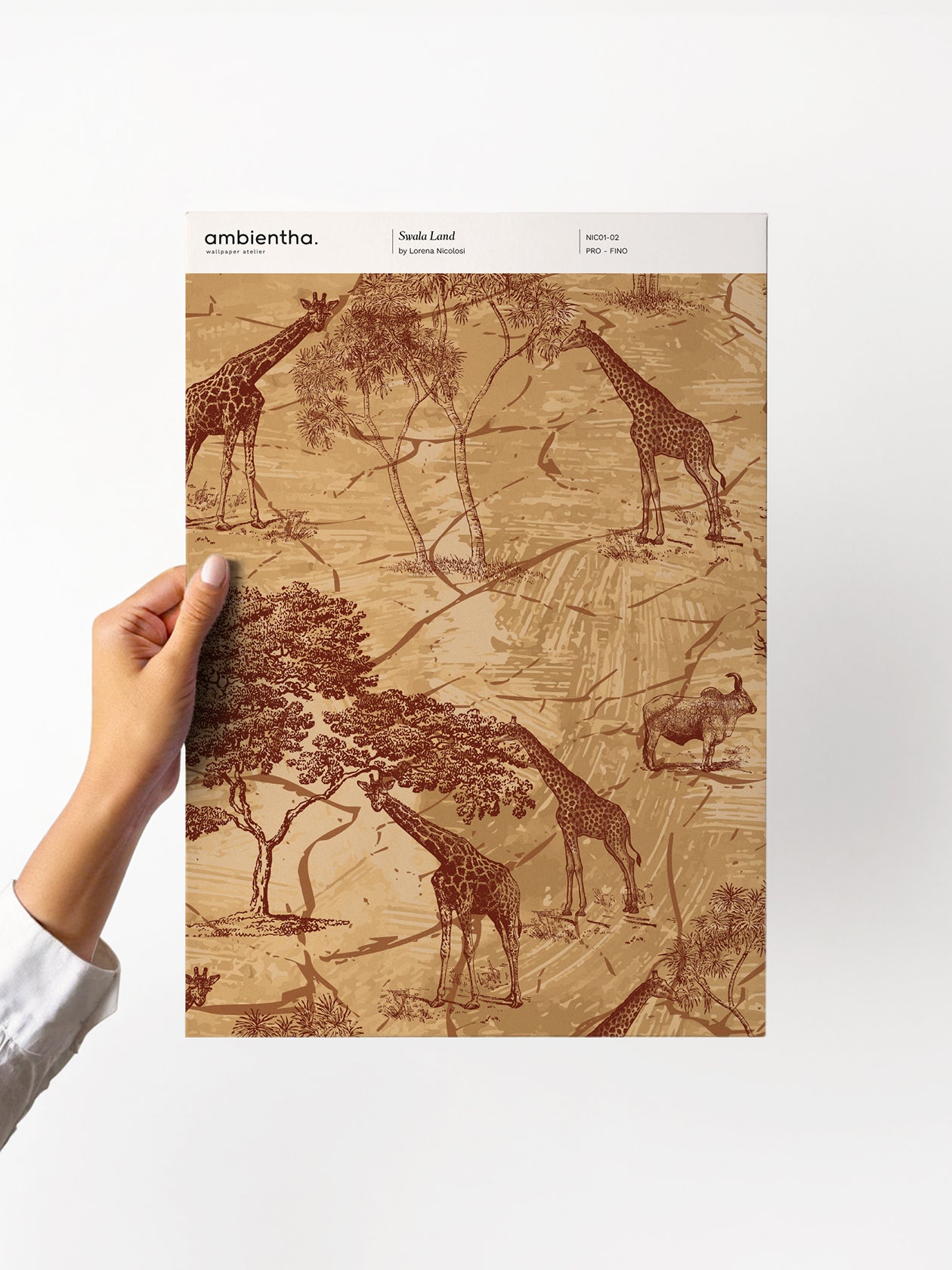 The pristine African land. Swala Land wallpaper dresses the walls in a contemporary ethnic style where the giraffe is the protagonist among the shades of the ferruginous soil. A pressing rhythm characterizes the environment as if to remember tribal sounds.