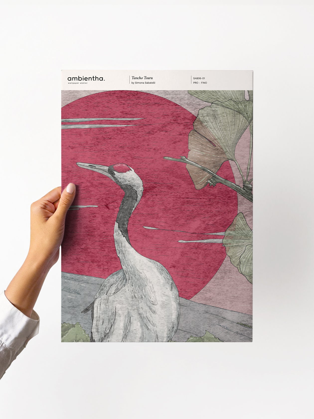 The red-headed crane, an elegant symbol of loyalty and long life. Tancho Tsuru wallpaper recalls distant times and ancient traditions for elegant oriental atmospheres. The palette enhances the rising red sun, the focal point of the scenario.