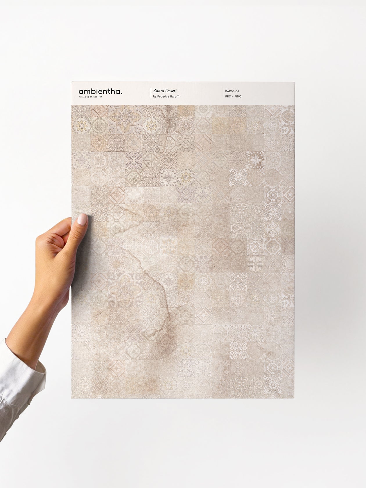 A tribute to the ancient decorative art of Morocco. The typical Berber tiles of master craftsmen as in relief in wallpaper. The marks of watercolor reveal their details, the walls dress in a light lace in the colors of the Sahara.