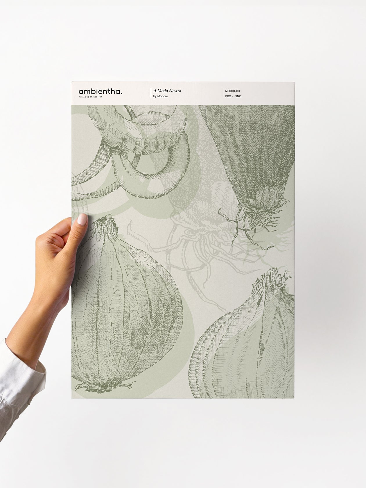 Nutrire l’anima con la bellezza del cibo. Dare spazio a quel boccone di cultura italiana che profuma di famiglia, di origini, di gesti abitudinari ma mai banali. La carta da parati per decorare le pareti della cucina con le sue tonalità verdi e delicate per ‘farti sentire a casa’. Il design indugia con lo sguardo nell’umile ingrediente star della cucina: la cipolla. Mille varietà intriganti, all’inizio di ogni ricetta: disegnarle è un atto di riconoscenza verso la nostra terra.
