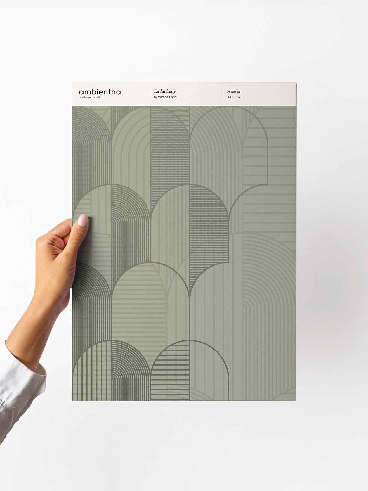 Gli archi si propagano come onde sonore. Continuità e fluidità caratterizzano il ritmo del design geometrico. L’effetto grafico diventa una trama che si estende sulle pareti e svanisce pian piano di contrasti. La tonalità verde salvia ammorbidisce l’estetica: soluzione decorativa per caratteri determinati che cercano un approccio stilistico sobrio ma accattivante, perfetta per interni dallo stile Art Déco contemporaneo.