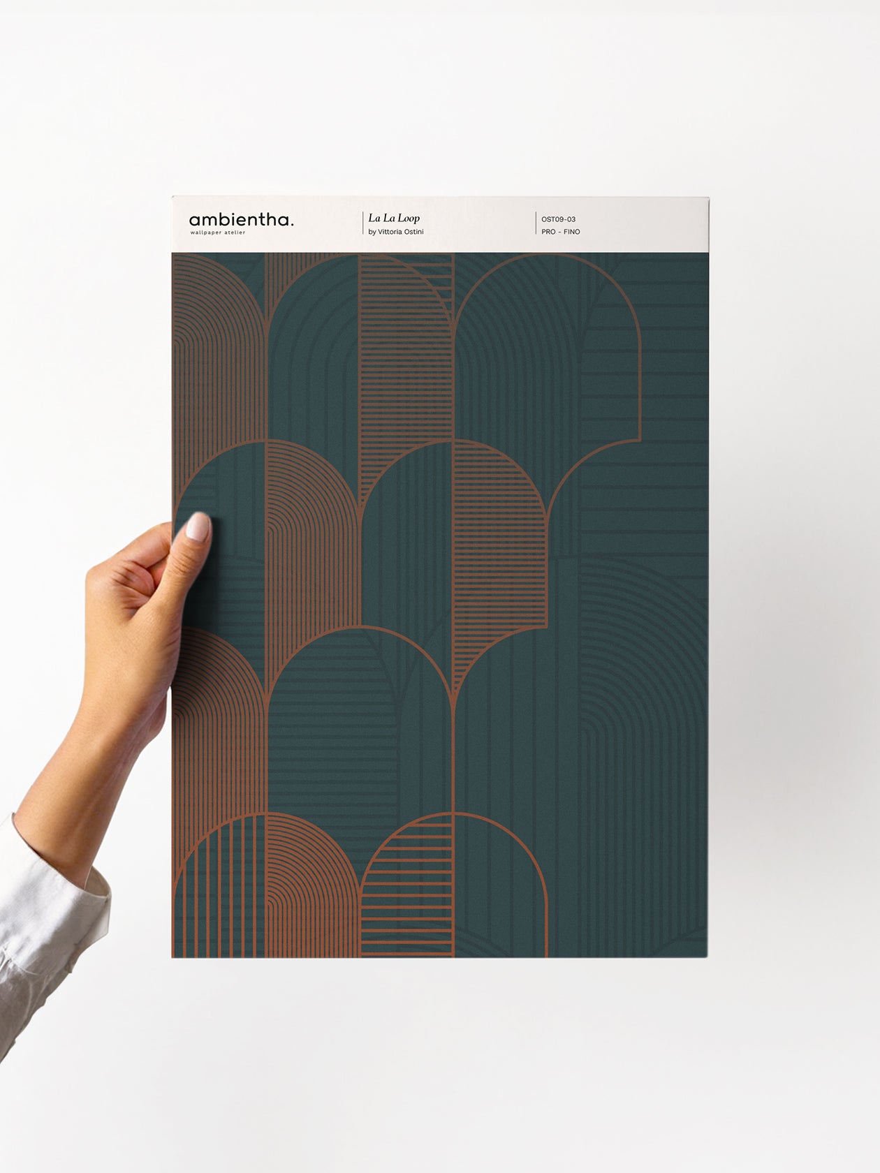 Gli archi si propagano come onde sonore. Continuità e fluidità caratterizzano il ritmo del design geometrico. L’effetto grafico diventa una trama che si estende sulle pareti e svanisce pian piano di contrasti. La palette petrolio e arancio esalta la dinamicità del motivo, trasformando la parete in un punto focale di grande impatto visivo.