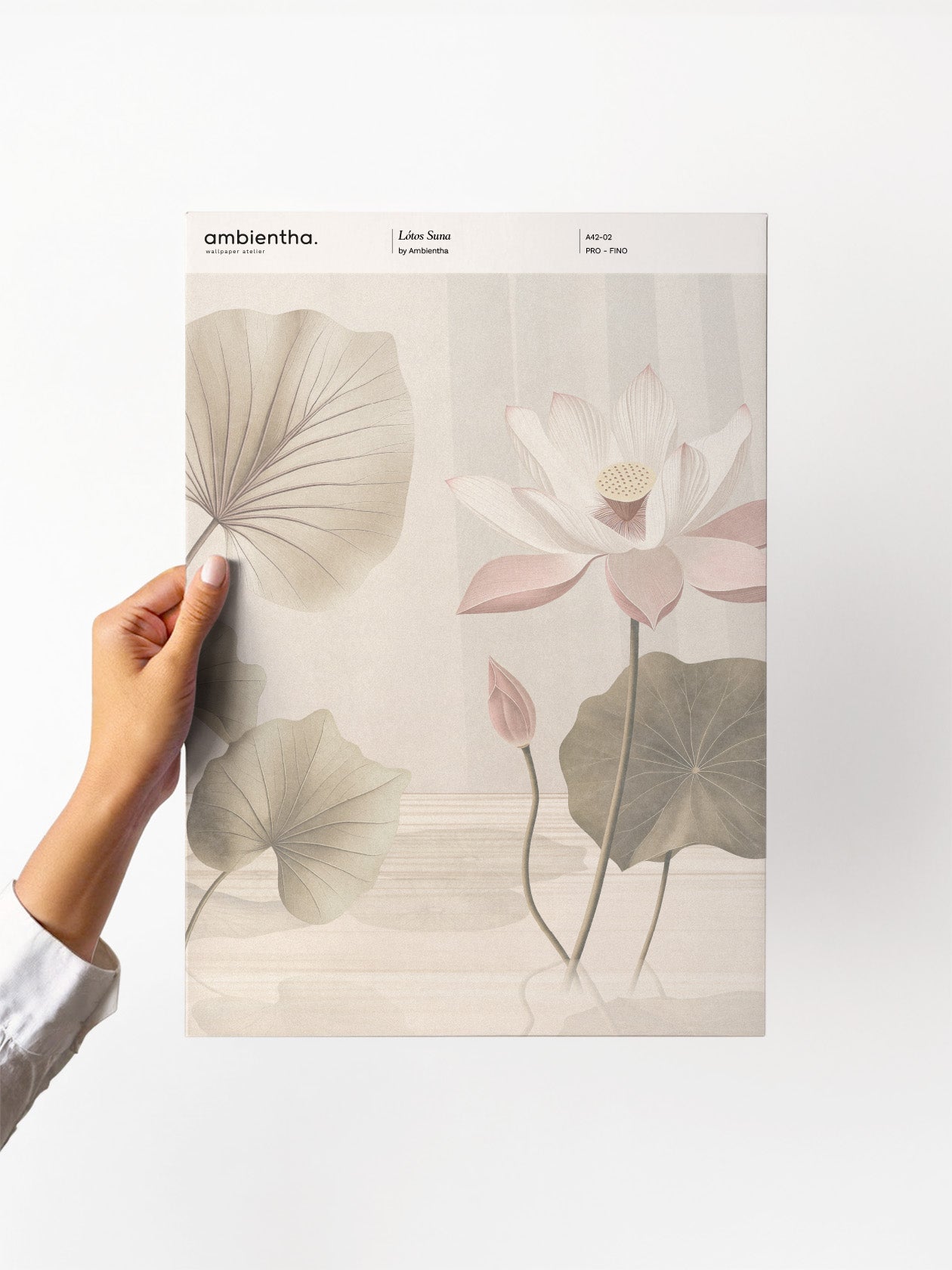 Scopri il campione della carta da parati Lótos Suna nei toni cipriati e lattiginosi. La reinterpretazione floreale del Lótos qui si rivela appena, come vista attraverso un velo. È un design da osservare con lentezza, come un giardino zen.
