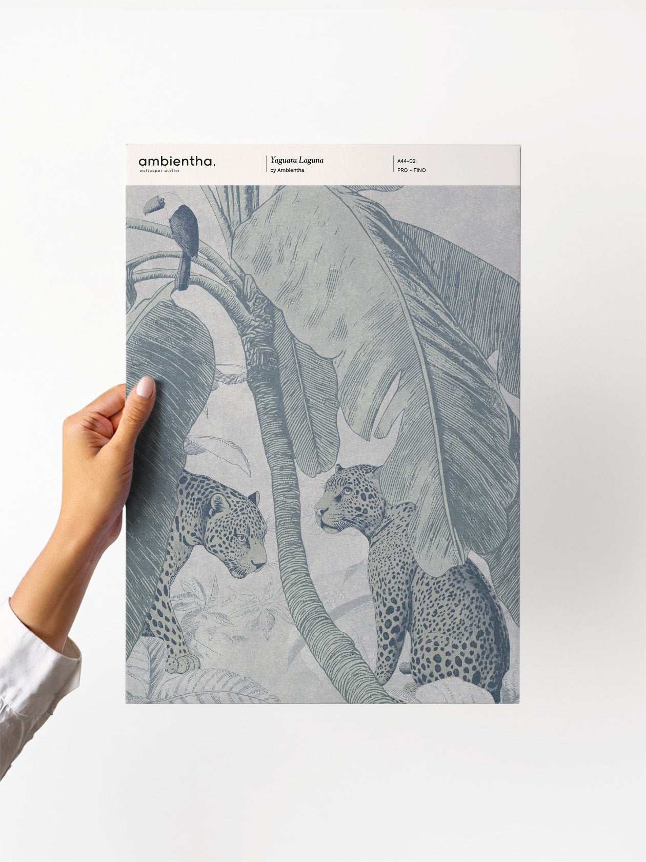Scopri il campione della carta da parati Yaguara Laguna: la tonalità laguna con riflessi che evocano il corso lento di un ruscello al chiaro di luna. Meditativa e sensuale.