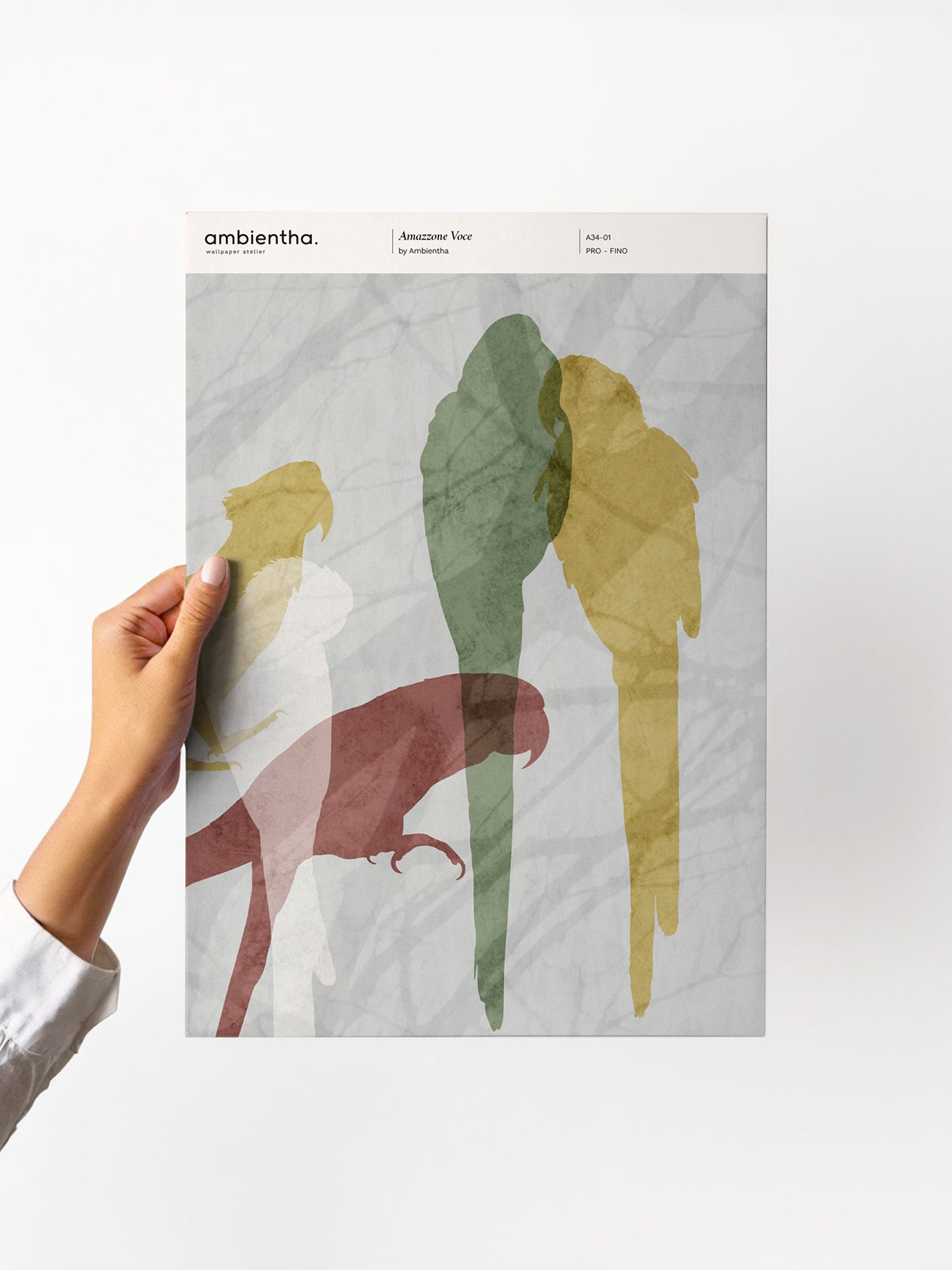 Amazzone Voce, dove l’appuntamento dei pappagalli da vita ad un coro in volo. La carta da parati regala un fondale ethnic pop agli interni. Voce è il design per creare piccoli angoli scenografici o raccontare un’ampia storia su lunghe pareti.
