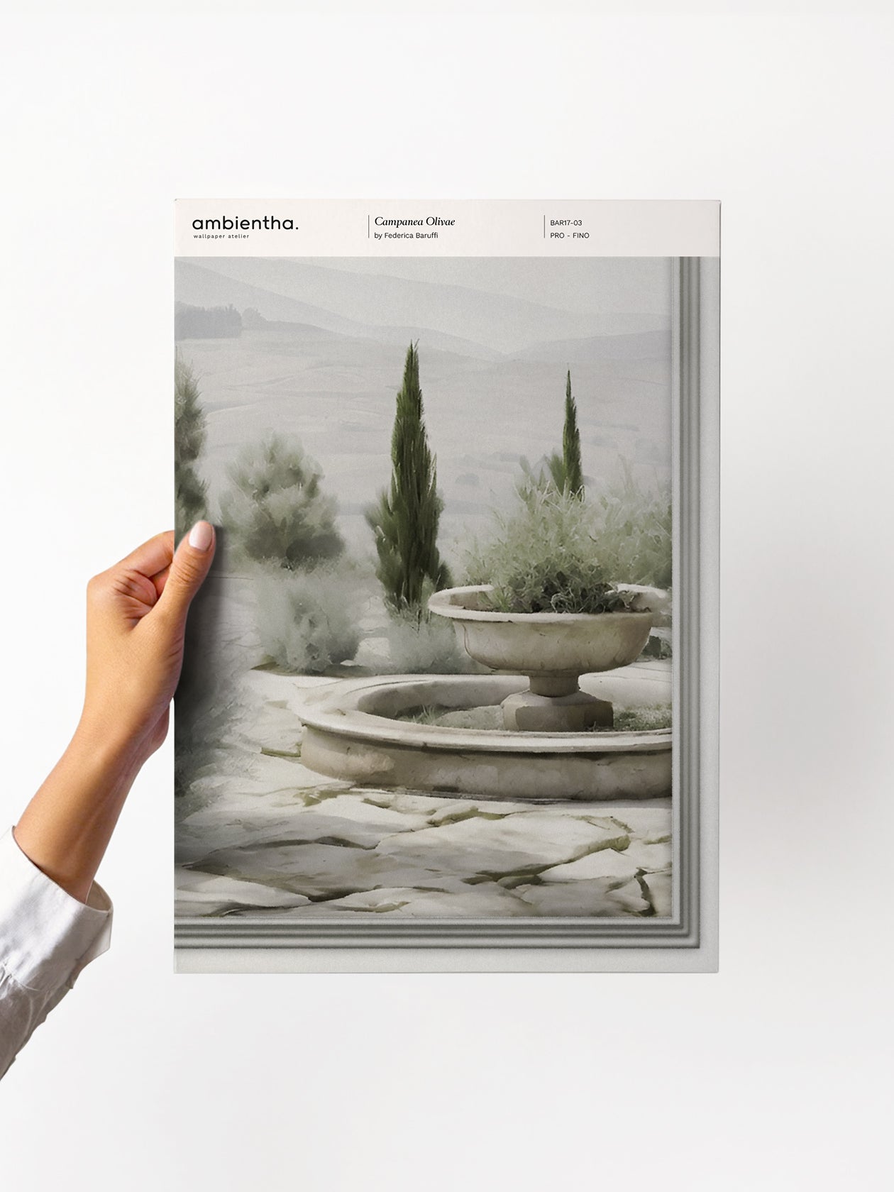 Lo sguardo e la memoria si dirigono verso il giardino: eccoli i romantici paesaggi collinari del centro Italia. I quadri prospettici dai toni freddi della carta da parati Campanea Olivae sono la soluzione panoramica per progetti dallo stile rustico e classico.