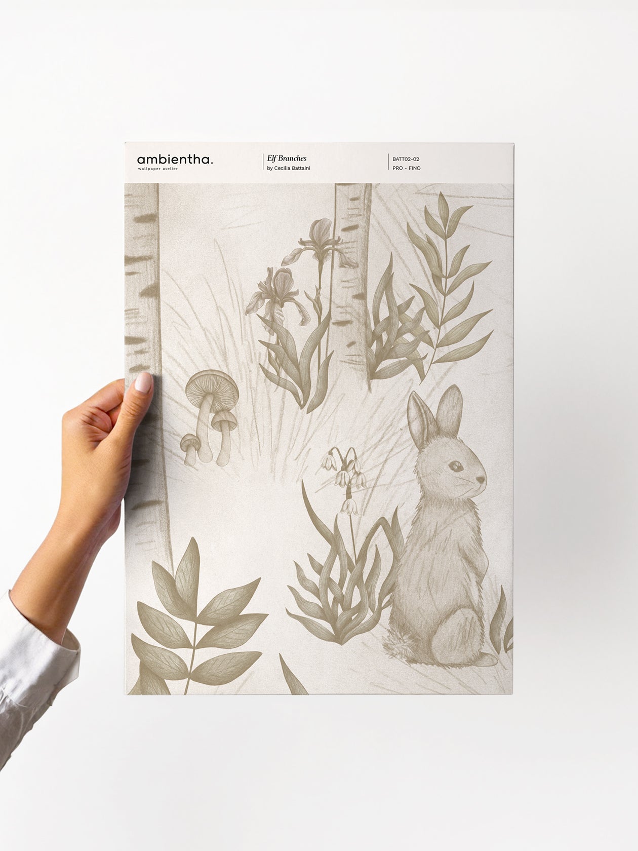 Trovare riparo e conforto nella natura. Il legame con l’ambiente si instaura fin da piccoli. La fiaba nel sottobosco della carta da parati color seppia anima la cameretta con preziosi dettagli disegnati a matita, che aguzzano la vista e la fantasia.