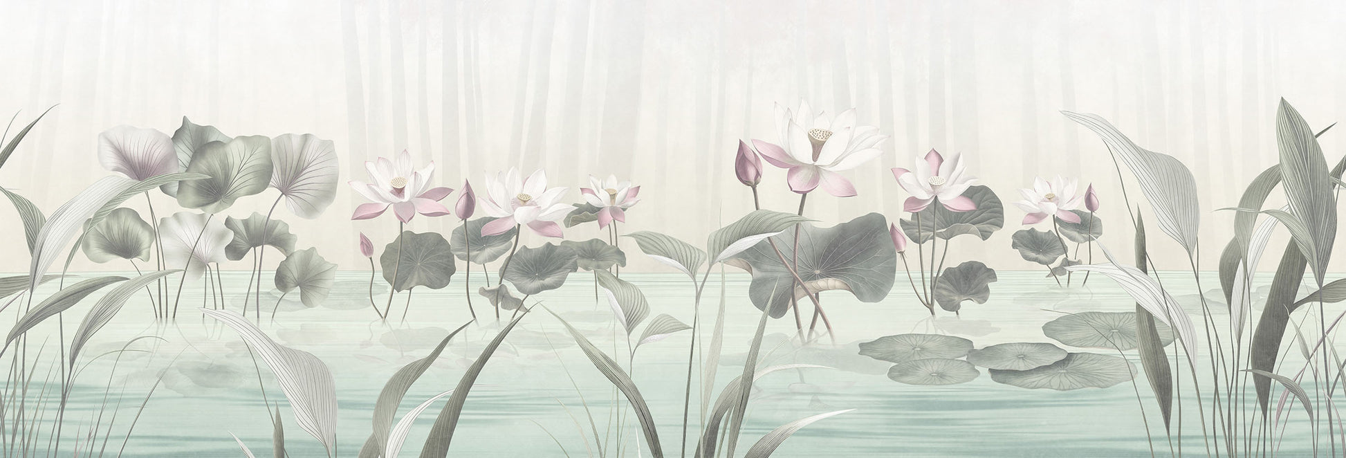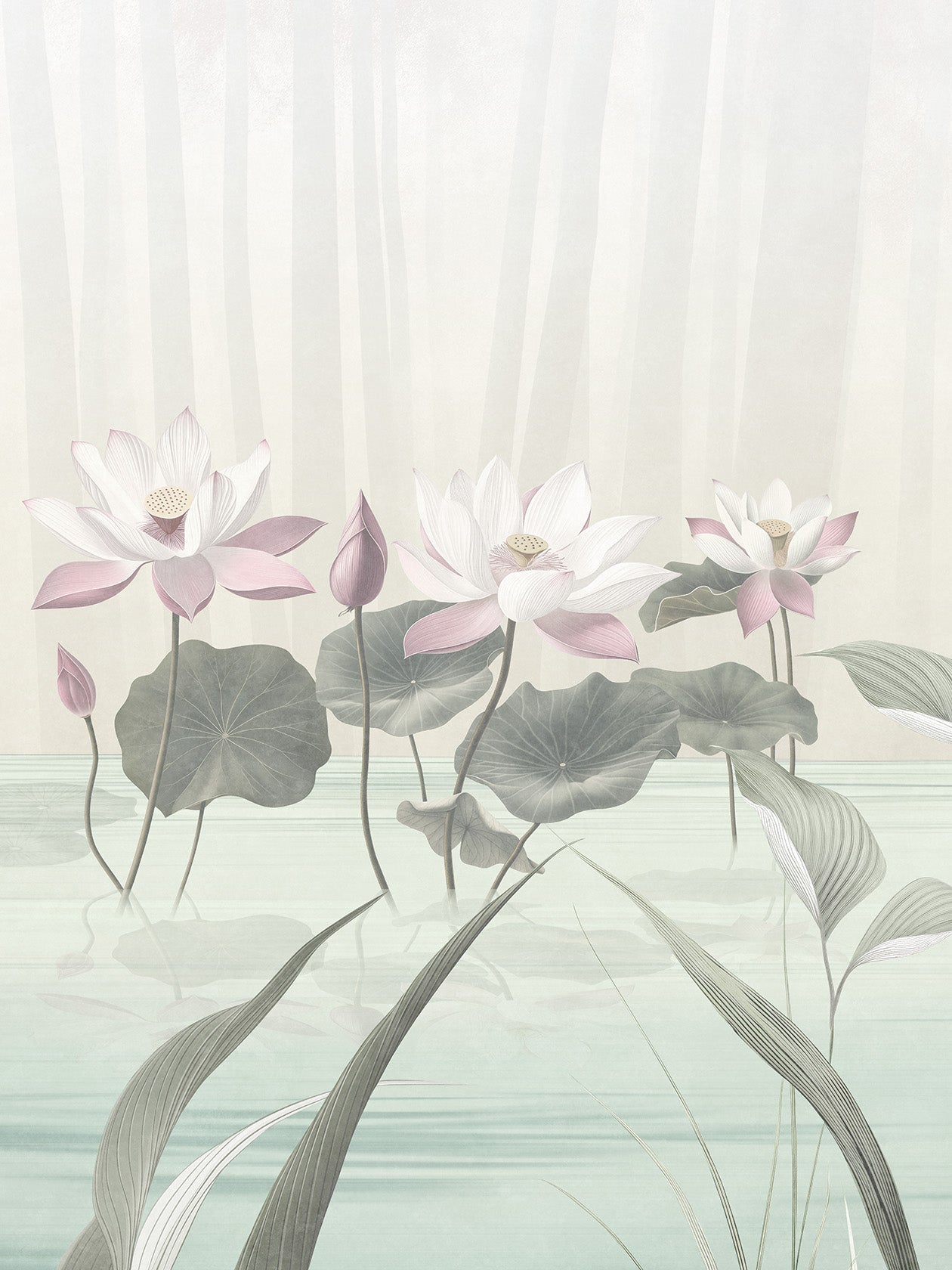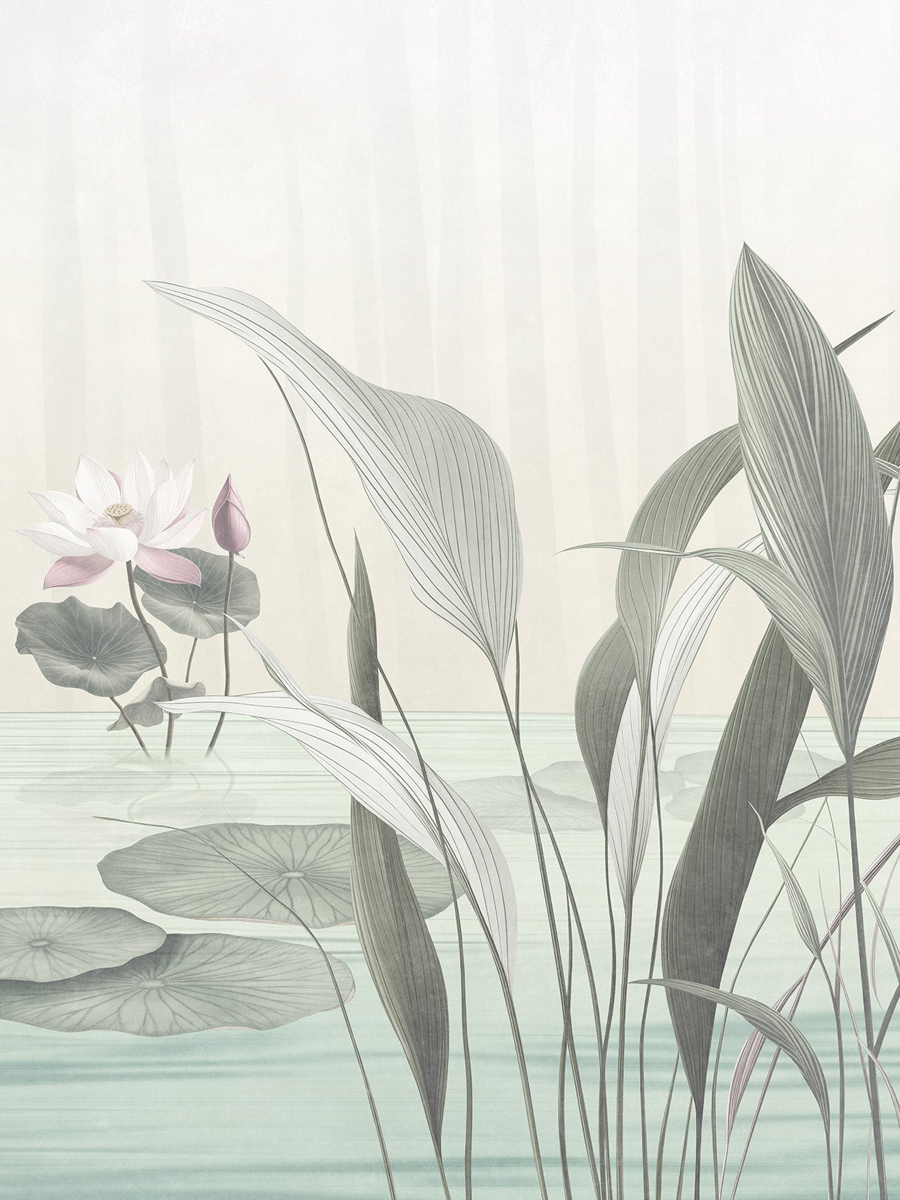 Kasumi, nebbia in giapponese, è la carta da parati sussurrata, nei toni cipriati e lattiginosi. La reinterpretazione floreale del Lótos qui si rivela appena, come vista attraverso un velo. È un design da osservare con lentezza, come un giardino zen. Ideale per: testiere letto sospese, ambienti minimalisti, bagni raffinati con vasche freestanding. Abbinamenti consigliati: gesso grezzo, lampade di carta giapponese, legno chiaro naturale.
