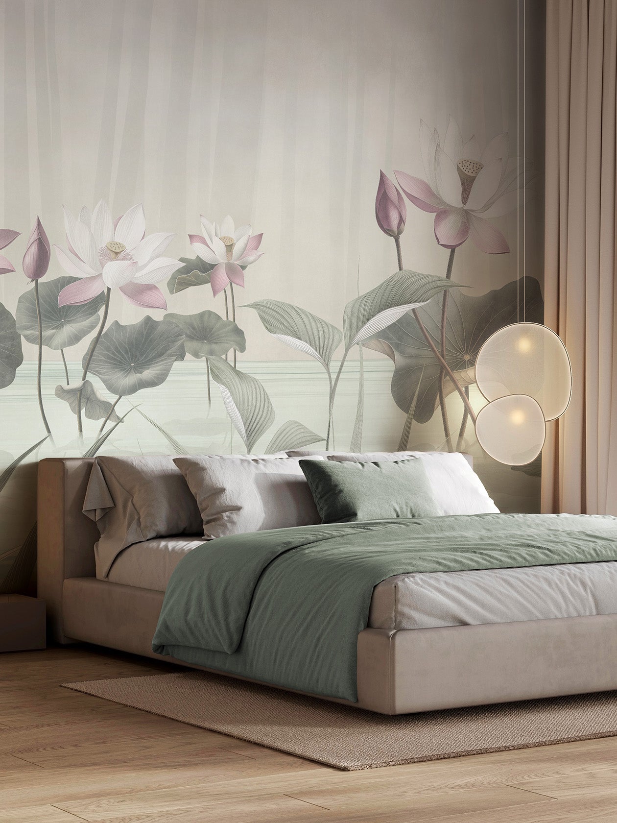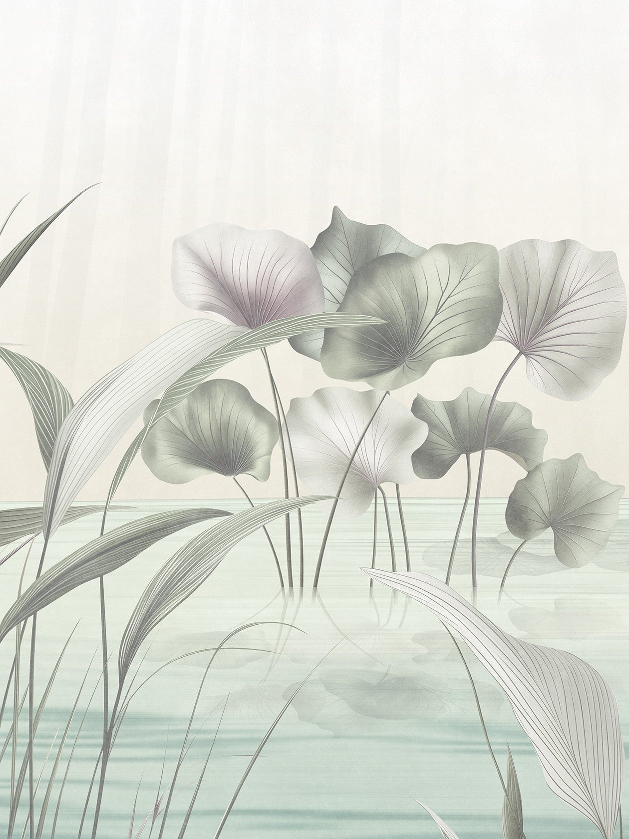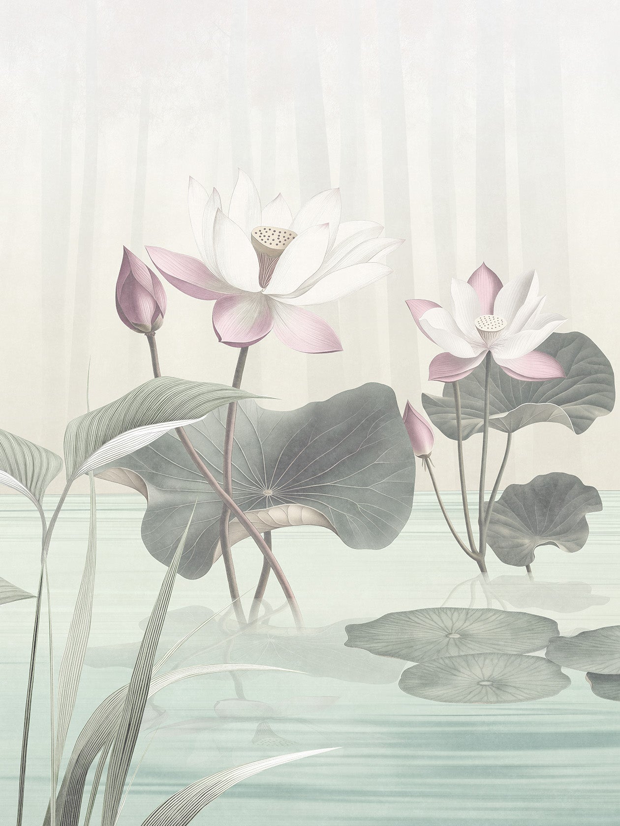 Kasumi, nebbia in giapponese, è la carta da parati sussurrata, nei toni cipriati e lattiginosi. La reinterpretazione floreale del Lótos qui si rivela appena, come vista attraverso un velo. È un design da osservare con lentezza, come un giardino zen. Ideale per: testiere letto sospese, ambienti minimalisti, bagni raffinati con vasche freestanding. Abbinamenti consigliati: gesso grezzo, lampade di carta giapponese, legno chiaro naturale.