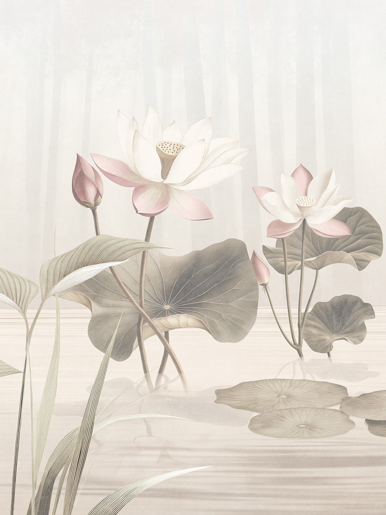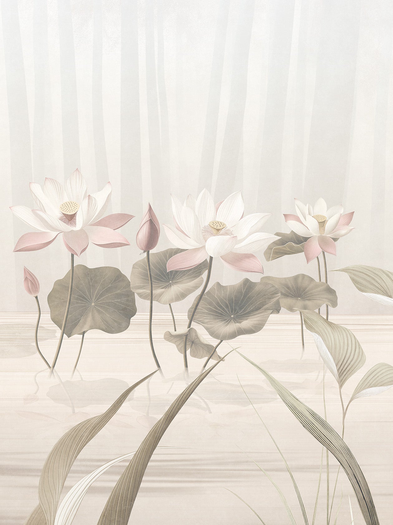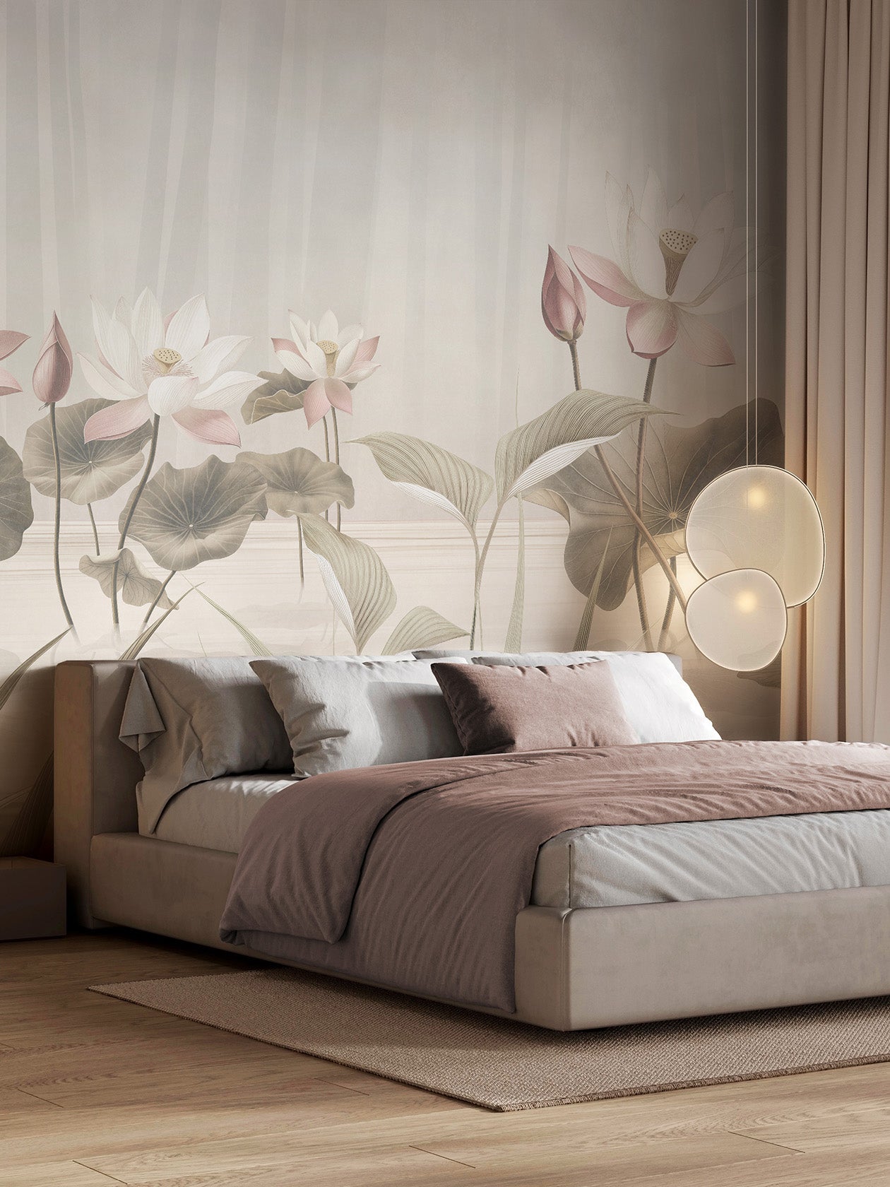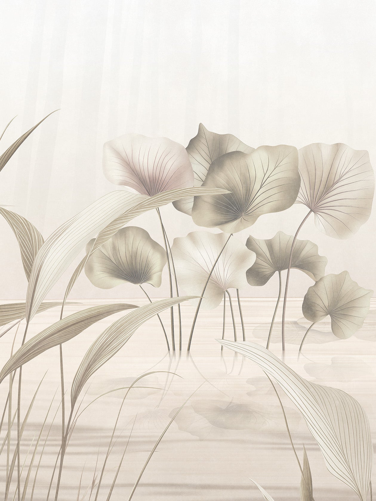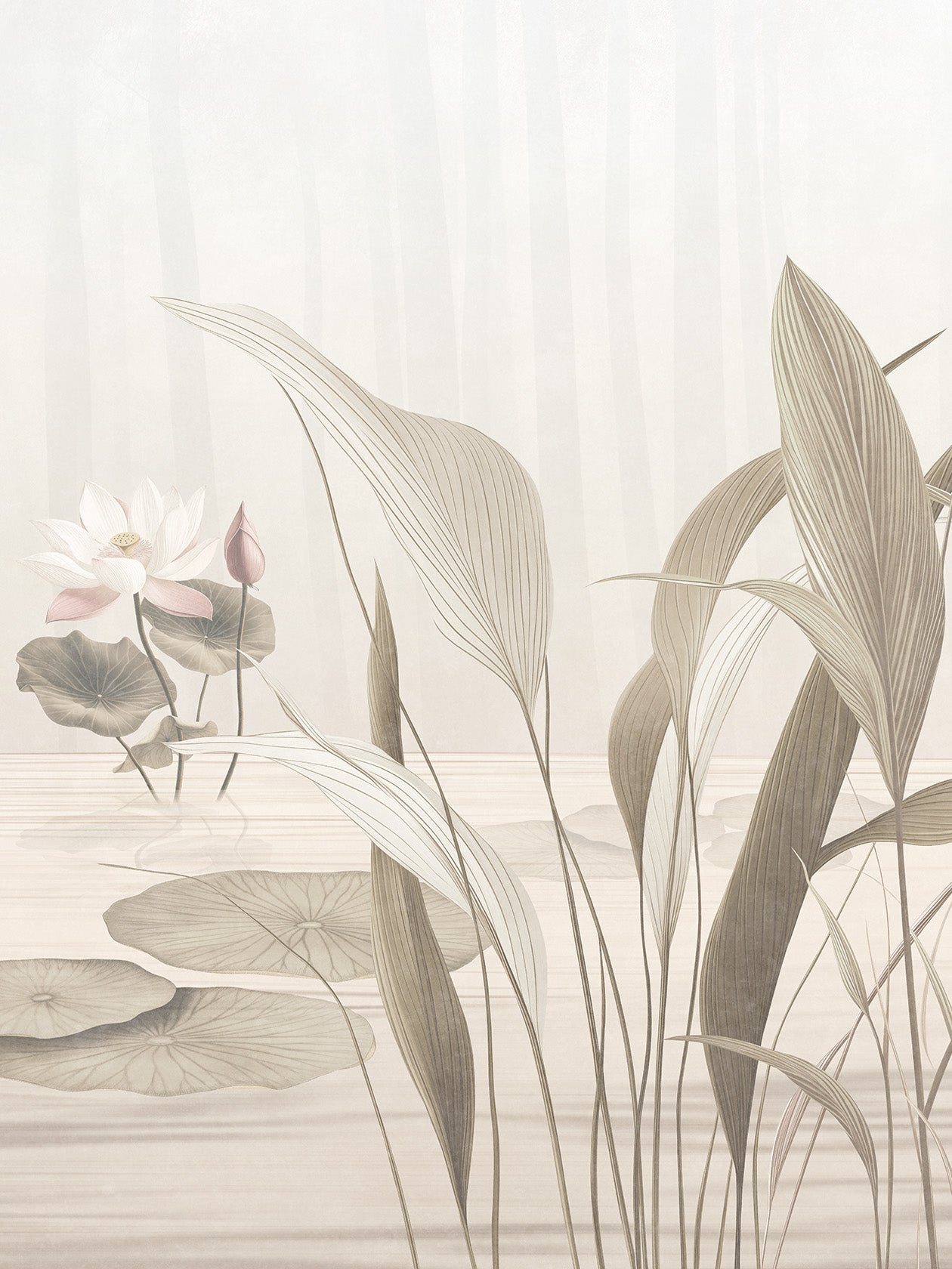 Suna, sabbia. Una palette terrosa, elegante, radicata della carta da parati Lótos. I fiori sembrano depositati sulla superficie come tracce di vento. Questa variante cromatica è una sintesi di equilibrio e naturalezza, pensata per ambienti materici. Ideale per: soggiorni e bagni soft contemporary, cucine con piano in travertino, studi d’artista. Abbinamenti consigliati: tessuti sabbia, mobili in rovere affumicato, ceramiche grezze.