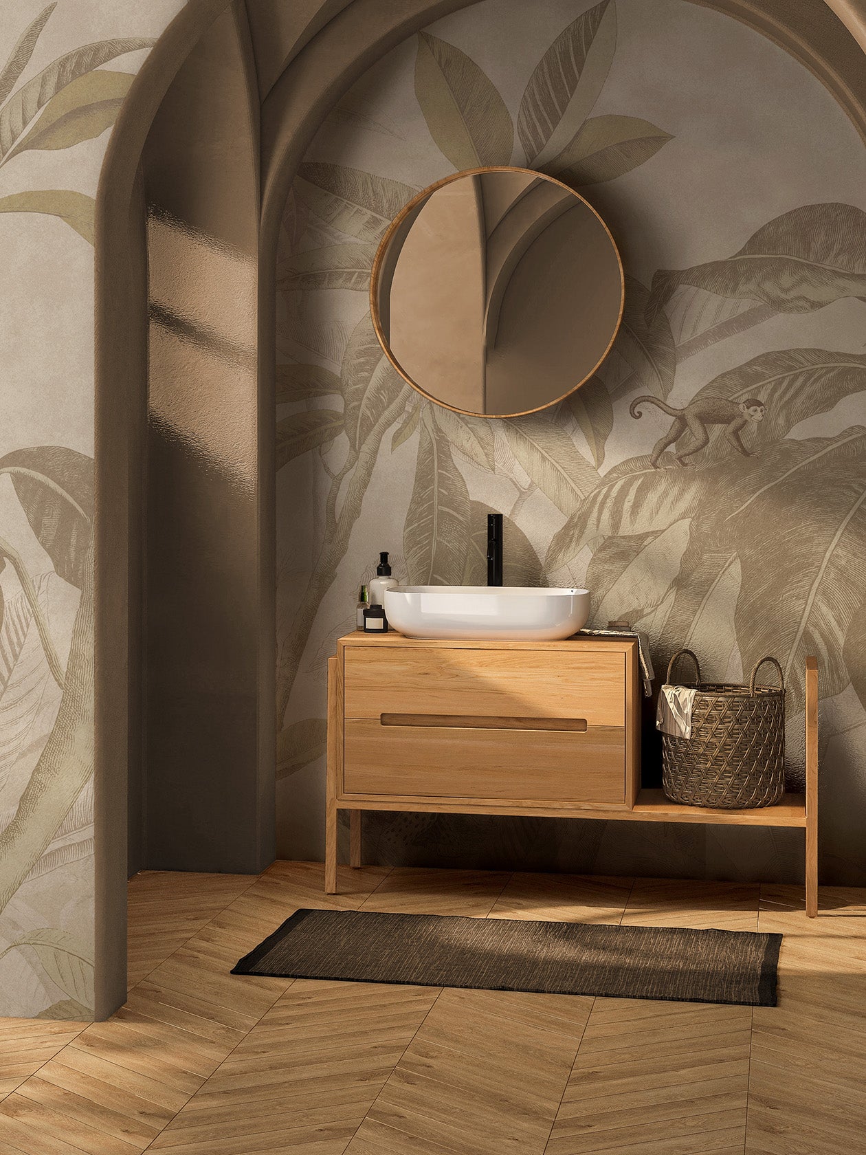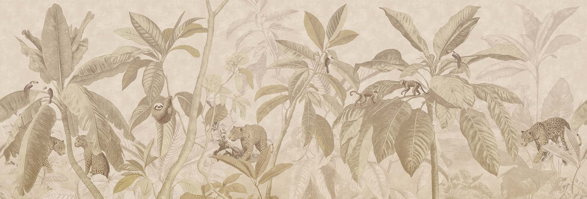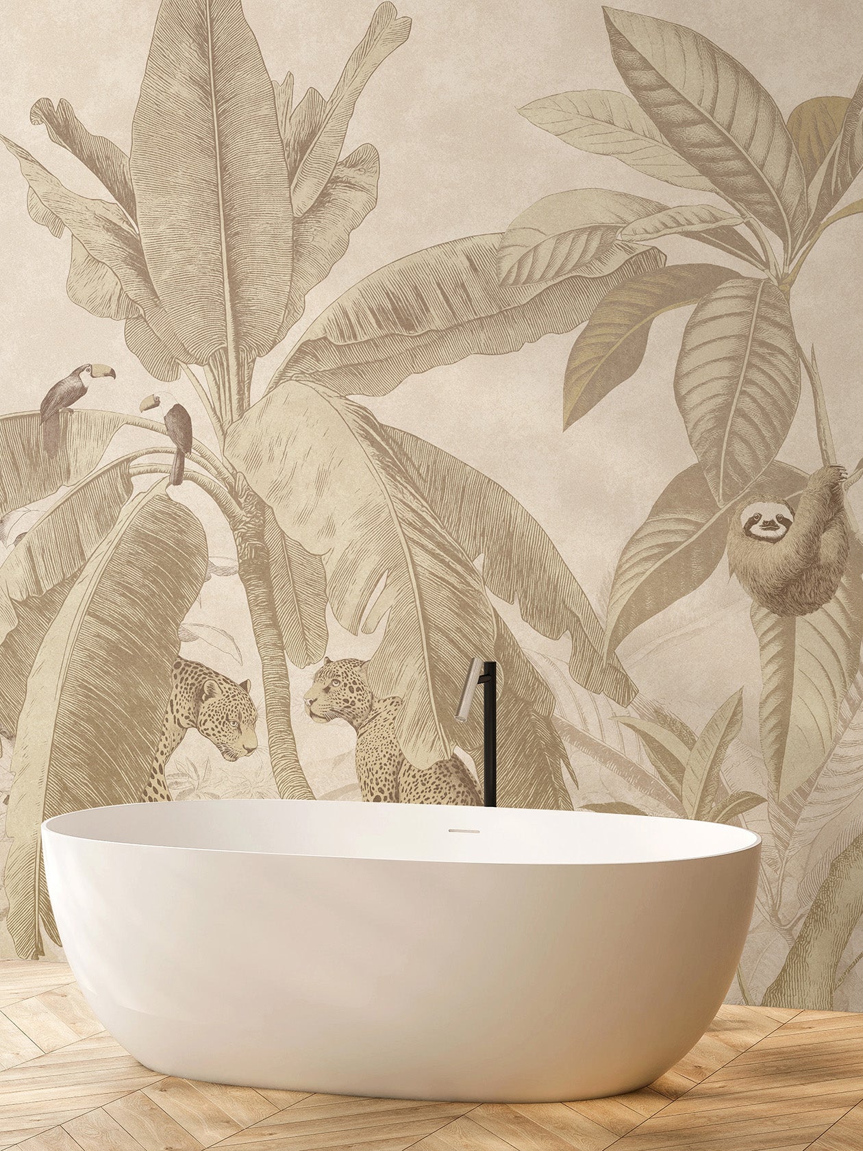 La carta da parati Yaguara Cacao dal beige sabbioso e caldo avvolge lo spazio come un tessuto grezzo ma prezioso. I dettagli dei maestosi giaguari emergono in un contrasto sottile, materico, che suggerisce profondità ma senza invadenza. Ideale per: zone giorno in stile soft contemporary, camere da letto dal gusto naturale, boiserie moderne con accenti bronzei o legni scuri. Abbinamenti consigliati: lino grezzo, mobili in teak o noce canaletto, decorazioni in ceramica artigianale.
